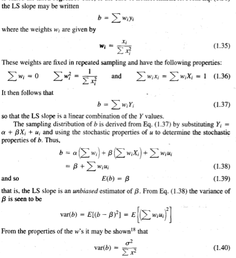 شیب تابع ریاضی b نامیده میشود که قرار است نمایندگی B جامعه در شکل تابع رگرسیون را ایفاد کند. برای همین با روش OLS متغیر b تعریف میشود. حال برای این که فهمیده شود چه پیامدی میتوانیم برای نقوض فروض کلاسیک تصور کنیم متغیر Y جایگزین متغیر y میشود(۱.۳۷). این مساله سبب میشود که برخی نقوض فروض کلاسیک پیامدهایی مانند اریب، ناکاریی (از طریق محاسبه واریانس متغیر b) پیدا کنند. مساله اصلی این است متغیری مانند b که با جایگزینی متغیر Y به جای y بدست آمده است؛ نمیتواند شبیه سازی برای بیان پیامد نقض فروض کلاسیکی باشد. بنابراین توسل به پیامدهایی مانند اریب نا اریب کارایی و عدم کارایی برای نقض فروض کلاسیک بجای مجوز OLS به شرط اصلاح شکل تابع رگرسیون، میتواند یکی از انتقاد ها به اقتصاد سنجی بیان و معرفی گردد.