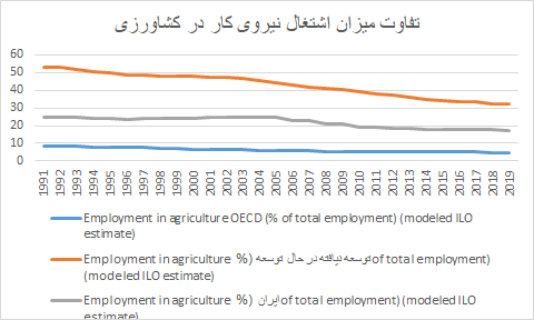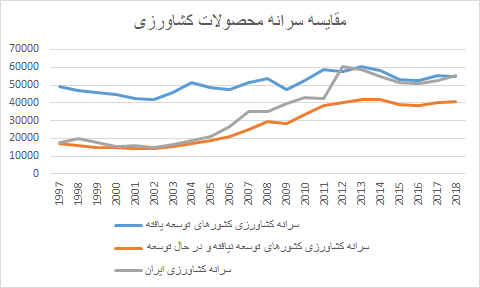 با این حال زمانی سرانه محصولات کشاورزی بین ایران کشورهای توسعه نیافته و در حال توسعه OECD  مورد مقایسه قرار میگیرد، تفاوت در سرانه محصولات کشاورزی دیده نمیشود  و حتی سرانه محصولات کشاورزی در ایران از سرانه محصولات کشاورزی کشورهای توسعه یافته OECD  پیشی گرفته است.