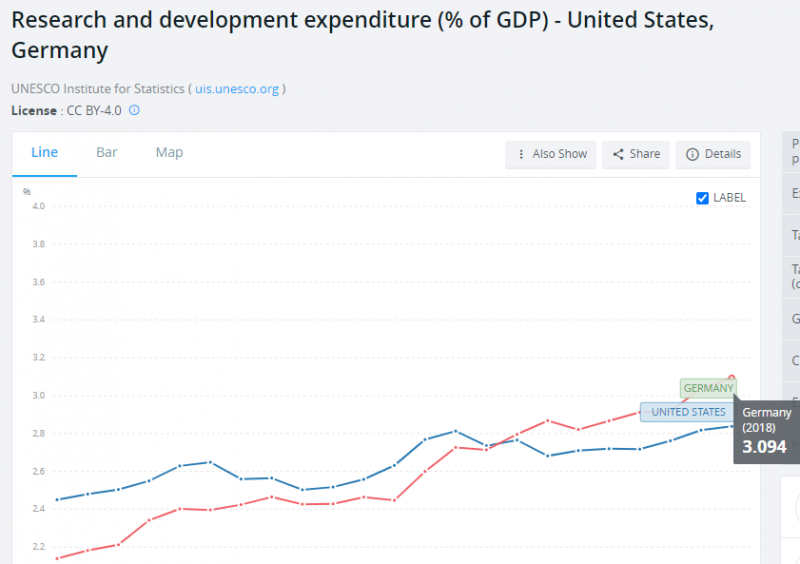 نمودار زیر سهم تحقیق و توسعه در تولید ناخالص داخلی کشورهای توسعه یافته رانشان میدهد که علت این که جایگاه بالایی برای تحقیق و توسعه در تولید ناخالص داخلی نشان نمیدهد گفته شد: