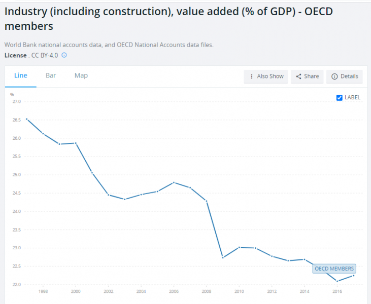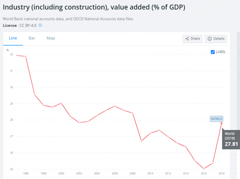 با آنکه کمتر از سی درصد از تولید ناخالص داخلی بخش صنعت است در همین بخش صنعت، بخش هایی مانند صنعت بیمه حمل و نقل و صنعت مالی وجود دارد که اینها حجم بالای بخش صنعت را پوشش میدهند. یعنی باز هم سهم خدمات گسترده تر و سهم صنعت کم تر است..