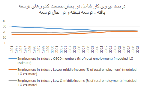 تقریبا ۷۸ درصد نیروی کار در کشورهای توسعه یافته در بخش خدمات، ۲۳ درصد در بخش صنعت و نزیک ۵ درصد در بخش کشاورزی هستند. کشورهای توسعه نیافته و در حال توسعه نیز خود را به سطح نیروی کار شاغل در بخش صنعت رسانیده اند.