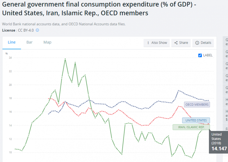 سهم مخارج دولت در تولید ناخالص داخلی کشورها کمتر از بیست درصد است. به بیان دیگر سهم بودجه در تولید ناخالص داخلی در شرایطی برای کشروهای توسعه یافته و کشور ایالات متحده هفده و چهارده درصد است که برای ایران این رقم نزدیک به همان چهارده درصد می باشد.